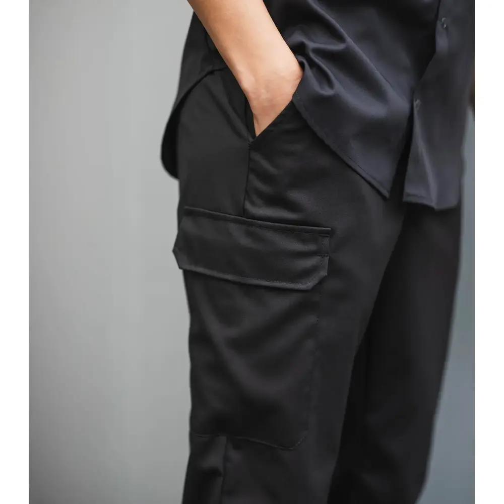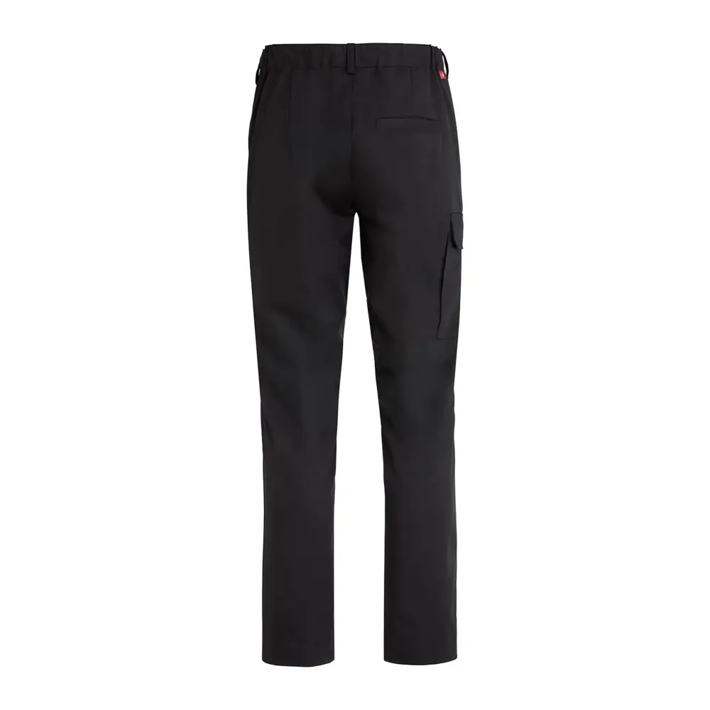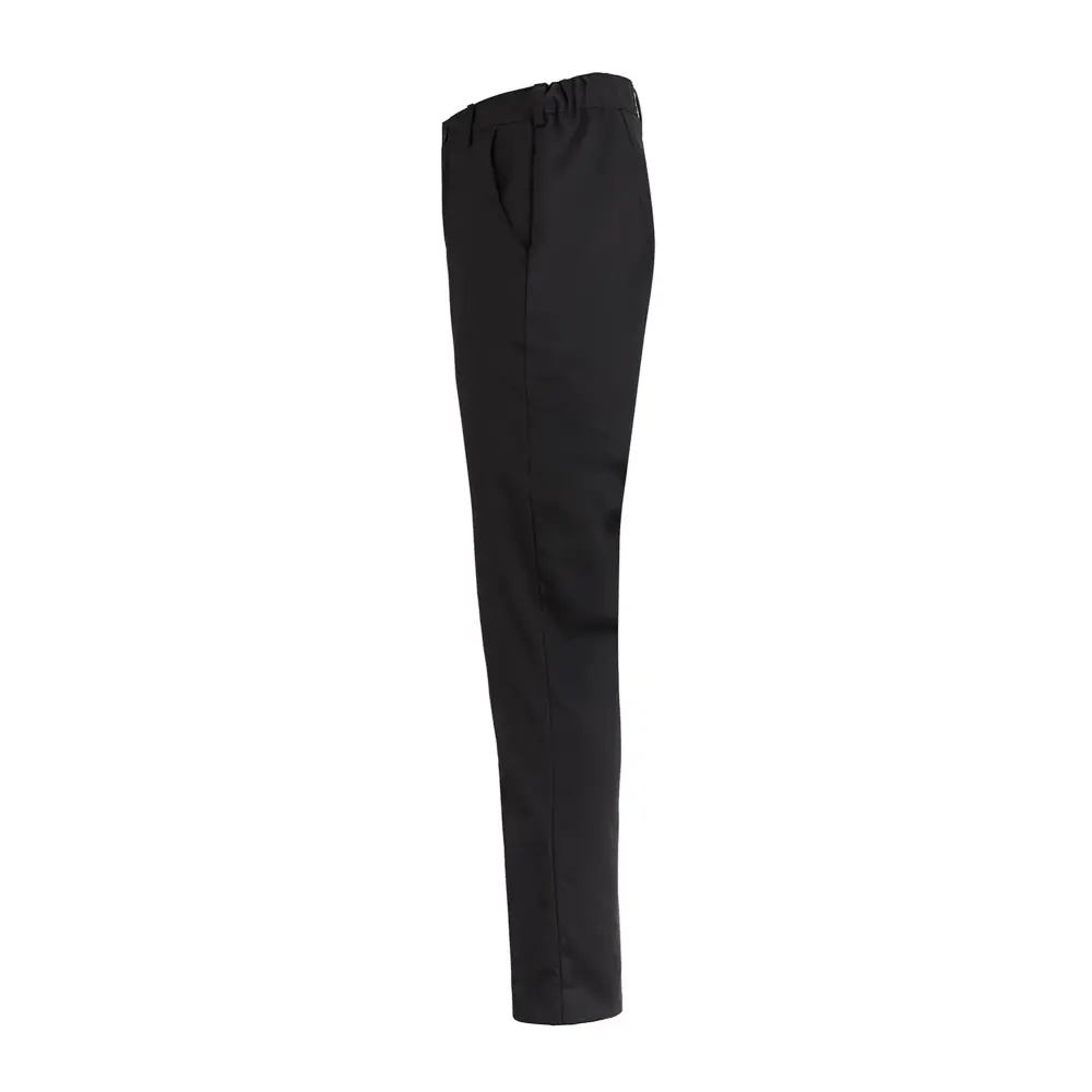 Kokkbukse/Chinos i unisex-modell med benlomme. Stoffet er i stretch og har elastisk linning bak for bedre passform. Praktiske sidelommer, baklomme og benlomme med klaff. Benkantene kan enkelt justeres til en lengre lengde.