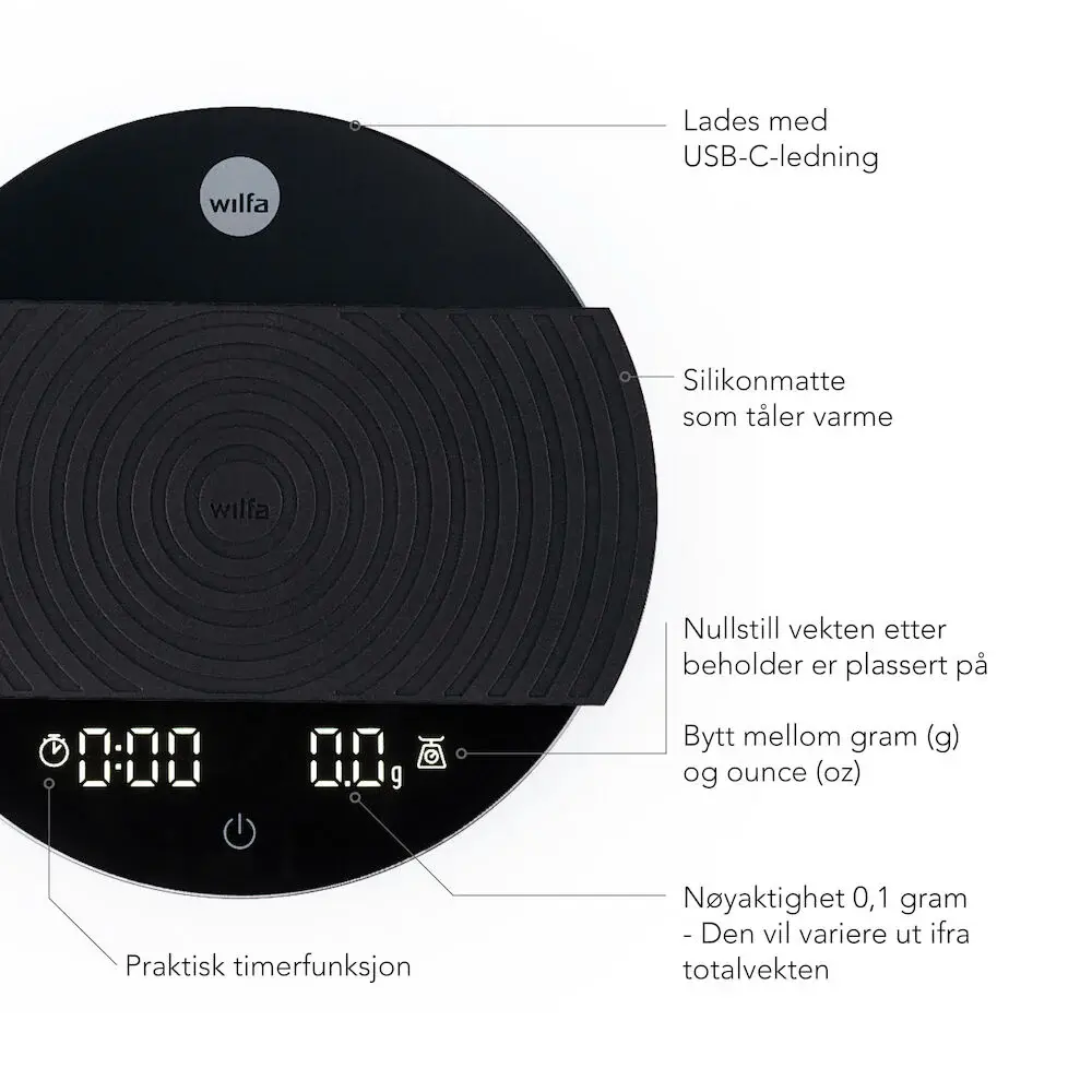 Via Bluetooth kan du koble vekten til Wilfa Svart-appen, som guider deg til det perfekte brygg-forholdet mellom kaffe og vann. Appen gir deg kontroll over både tid og mengde, helt ned til siste dråpe.